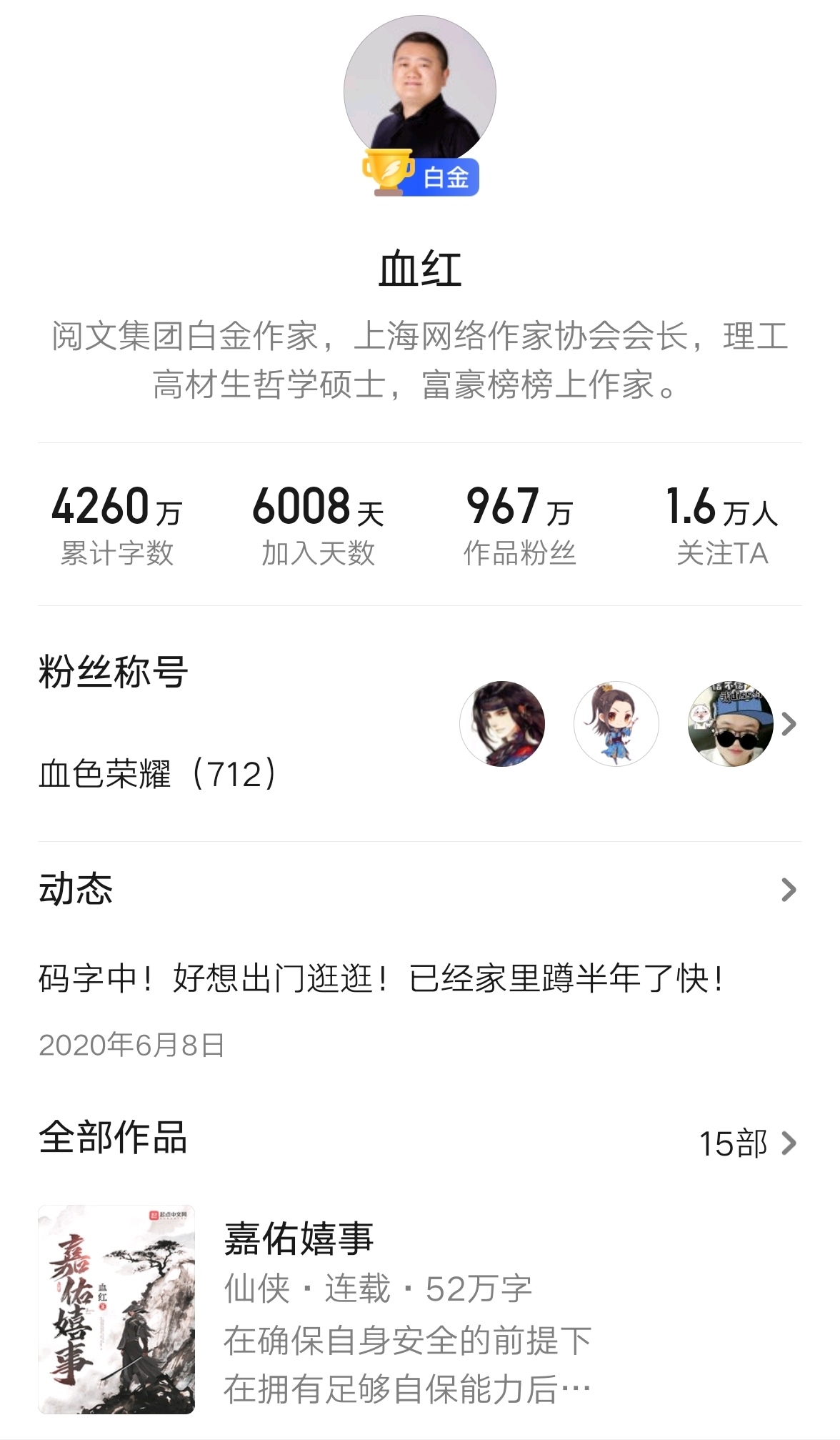可以說,血紅的創作生涯已經走過了近二十年的時間,早在2013年,血紅就已經跟唐家三少一起進駐中國作家富豪榜。血紅當之無愧的是網文第一批走上致富之路的作家之一了。而時至今日,血紅仍然能夠活躍在創作之路上,不得不說是讀者之幸。