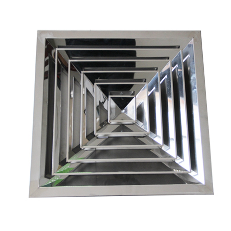 方形散流器為不銹鋼制做,表面經(jīng)過不銹鋼拋光處理。也可按用戶要求進行烤漆或靜電噴塑,顏色按用戶選擇。還可以按用戶要求配上調(diào)節(jié)閥或過濾網(wǎng)。方形散流器有四面吹,三面吹,二面吹等幾種出風(fēng)形式。三面吹散流器適于安裝在靠墻較近的天花板上,二面吹散流器適于安裝在墻角附近的天花板上,用戶可根據(jù)安裝位置選用不同出風(fēng)方向的散流器。