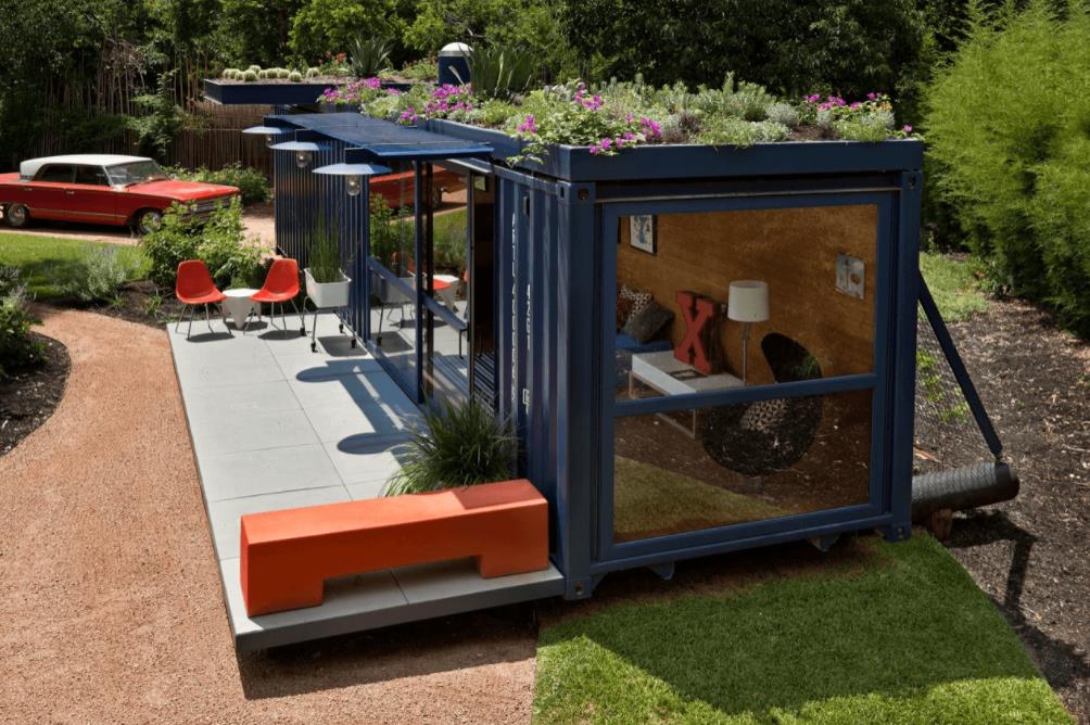 雖然這個(gè)小鋼棚的面積只有320平方英尺,但看起來相當(dāng)舒適。尤其是作為一個(gè)溫暖的,木鑲板的招待所,放在你的后院。這個(gè)舊的集裝箱只有8英尺寬,40 英尺長, 這只是足夠的空間擠進(jìn)折疊床、一些椅子、水池和浴室。不過最好的特色是安裝在屋頂上的花園空間。
