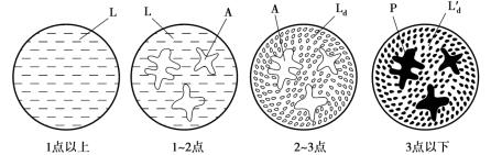 2.11%<w C<4.3%,結晶過程與共晶白口鐵基本相同,區別是共晶轉變之前有先結晶相A形成,因此其室溫組織為P+ Fe3 CⅡ+ L′d。結晶過程如圖1.3.11所示,顯微組織如圖1.3.12所示,圖中黑色點狀、樹枝狀為珠光體,黑白相間的為萊氏體,二次滲碳體與共晶滲碳體在一起,難于分辨。