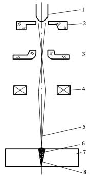 電子束焊接的定義 2019-07-0510:39:01電子束焊接的定義已關(guān)閉評論電子束焊接方法(圖4.3.5)屬于高能密度焊接方法。其特點(diǎn)是焊接時的能量密度大,可以焊出寬度小、深度大的焊縫,熱影響區(qū)以及焊接變形很小。電子束焊在真空中進(jìn)行,焊縫受到充分保護(hù),能保證焊縫金屬的高純度。電子束焊以前多用于航空航天、核工業(yè)等部門,焊接活性材料及難熔材料。現(xiàn)已應(yīng)用在汽車制造、工具制造等工業(yè),如焊接汽車大梁及雙金屬鋸條等。圖4.3.5 電子束焊原理1—陰極 2—控制板 3—陽極4—電磁透鏡 5—電子束6—聚焦束 7—工件 8—焊縫 贊 0 分享