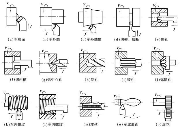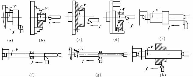 車削加工可以在普通車床、立式車床、轉(zhuǎn)塔車床、仿形車床、自動車床以及各種專用車床上進行。車削能加工的表面有:端面、內(nèi)外圓柱面、內(nèi)外圓錐面、螺紋面、回轉(zhuǎn)成形面、回轉(zhuǎn)溝槽以及滾花等,如圖5.2.1所示。