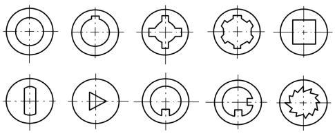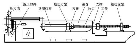 圖5.2.52為臥式拉床示意圖。其床身內裝有液壓驅動系統,活塞拉桿的右端裝有隨動支架和刀架,分別用以支承和夾持拉刀。拉刀左端穿過工件預加工孔,工件貼靠在床身上的“支撐”上。當活塞拉桿向左作直線移動時即帶動拉刀完成工件加工。拉床規格以額定拉力噸(t)表示。拉床適宜拉削的型孔如圖5.2.53所示。大批量生產中還廣泛用來拉削平面、半圓弧面和某些組合表面。拉削的尺寸精度等級一般可達IT9~IT7,表面粗糙度R a可達1.6~0.4。