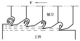 拉削加工在拉床上進行。拉刀的直線移動為主運動,拉削無進給運動,其進給是靠拉刀的每齒升高量來實現的,如圖5.2.51所示,拉削可以看作是按高低順序排列成隊的多把刨刀進行的刨削加工,它是刨削的進一步發展。