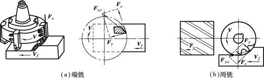 銑削過程中的總切削力F分解為3個相互垂直的分力,即切向力F z、徑向力F y和軸向力F x,如圖5.2.61所示。F z是作用在銑刀外圓切線方向的分力,可用來大致計算消耗在銑削過程中的功率;F x是作用在銑床主軸上的軸向力,可用來估算主軸軸向受力大小;Fy是作用在主軸上的徑向力。F y與F z的合力F y,z作用在銑刀刀軸上,使刀軸產(chǎn)生彎曲變形,影響加工精度。