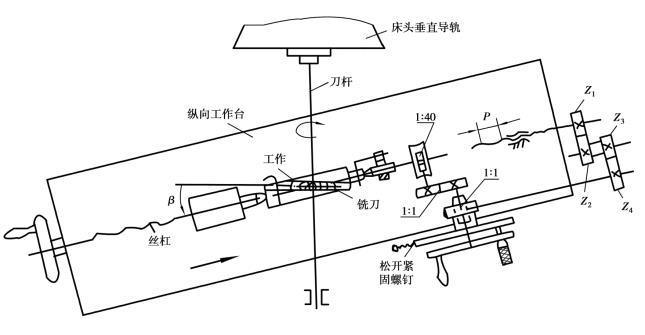若銑床縱向工作臺絲杠螺距為P,當(dāng)它帶動縱向工作臺移動導(dǎo)程L的距離時(shí),絲杠應(yīng)旋轉(zhuǎn)L/P圈,經(jīng)過掛輪Z1,Z2,Z3,Z4與分度頭內(nèi)部兩對齒輪(速比均為1∶1)和蝸桿、蝸輪(速比為1∶40)傳動,應(yīng)恰好使分度頭主軸轉(zhuǎn)過一圈。根據(jù)這一關(guān)系可得: